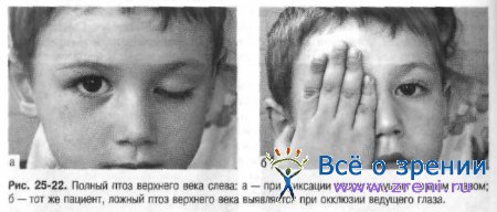 Симптомы: веки опущены частично или полностью, косоглазие, сужение полей зрения, раздражение глаз, утомляемость глаз, двоение в глазах, сухость слизистой глаз