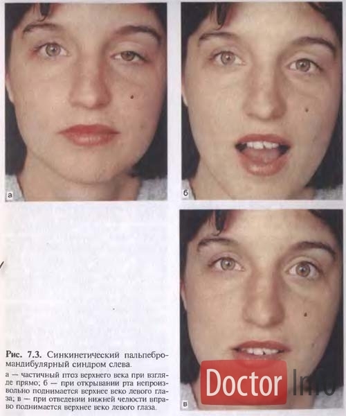 Следует различать: апоневротической птоз (опущение верхнего века), рассеянный склероз, миастения, злокачественное новообразование головного мозга, внутримозговое кровоизлияние