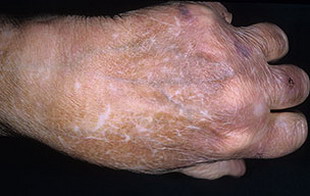 Атрофия кожи-истончение кожи, подкожной клетчатки, а иногда и более глубоких тканей. Этот процесс сопровождается дегенерацией эластиновых и коллагеновых волокон, вследствие чего кожа теряет эластичность, становится сухой, вялой и уязвимой. Часто она покрывается телеангиэктазиями и пигментными пятнами. На участках атрофии возможно развитие злокачественных новообразований.