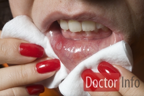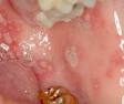Поражение слизистой оболочки полости рта и губ (афты с мутным содержимым, превращающиеся в язвочки размером 2-12 мм ярко-розового цвета, склонны к слиянию, бывают резко болезненны).