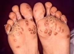 У каждого второго больного развивается поражение кожи на половом члене и слизистой оболочке полости рта (язвенный стоматит, глоссит). Появляются красные пятна на ладонях, подошвах или на всей коже, которые затем покрываются толстой коркой. Часто поражаются ногти (утолщение, ломкость).