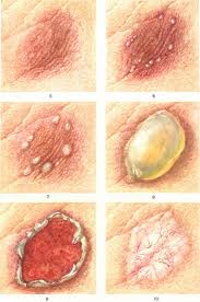 Симптомы: сыпь, сыпь на коже в виде пузырьков, пузыри на слизистых оболочках, эрозии на месте вскрывшихся пузырей, а также возможно проявление таких симптомов как лихорадка, недомогание, головная боль, тошнота и рвота, мышечные боли, насморк, заложенность носа, боль в горле