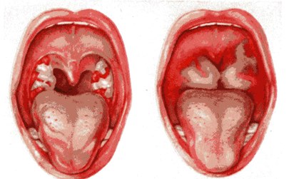 Симптомы: пленчатый налет на миндалинах, увеличение лимфатических узлов в области шеи, шумное дыхание (стридор), высокая температура (лихорадка), боль в горле, трудно глотать, увеличение небных миндалин, отечность, охриплость голоса, а также возможно проявление таких симптомов как слабость, бледность кожных покровов, кровавые водянистые выделения из носа, водянистые выделения из носа, поражения кожи