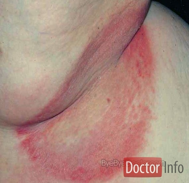 Поражаются чаще складки кожи:кожа под молочными железами,паховая область,подмышечные впадины, межпальцевые складки.