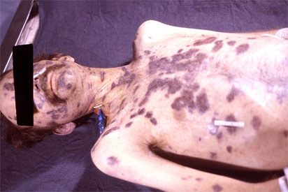 Симптомы: пигментированные узелки на коже и слизистых, затруднения при приеме пищи, увеличение лимфатичесиких узлов, боль в животе, кашель с кровью, одышка, хрипы в легких, отек вокруг глаз, отеки ног, язвы на коже