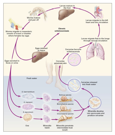 Мигрируя по кровеносным и лимфатическим сосудам, шистосомулы проникают в различные органы, вызывая их поражения. В портальных венах печени шистосомулы созревают до взрослых особей. Спаренные взрослые особи мочеполового ш. локализуются в венозных сплетениях мочевого пузыря, ш.Мансона и японского ш.— в разветвлениях брыжеечных и воротной вен. В венулах этих сплетений происходит яйцекладка. Яйца из сосудов, в зависимости от вида шистосом, продвигаются в просвет мочевого пузыря или кишечника. Миграция гельминтов и яиц травмирует ткани, а продукты их распада и жизнедеятельности вызывают аллергические проявления, характерные для острой стадии болезни. В результате повреждения тканей яйцами в хронической стадии развивается воспалительно-пролиферативный процесс, вокруг яиц, задержавшихся в тканях, образуются гранулемы.