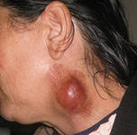 Развитие различных клинических форм заболевания связано с механизмом заражения и входными воротами инфекции, определяющими локализацию местного процесса. После проникновения возбудителя через кожу развивается бубонная форма в виде регионарного лимфоаденита (бубона). Возможно изолированное или сочетанное поражение различных групп лимфатических узлов - подмышечных, паховых, бедренных. Возникают болезненность, а затем увеличение лимфатических узлов до размеров лесного ореха или мелкого куриного яйца. При этом болевые реакции постепенно уменьшаются и исчезают. В динамике заболевания бубоны медленно (иногда в течение нескольких месяцев) рассасываются, нагнаиваются с образованием свища и выделением сливкообразного гноя или склерозируются.