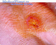 Язвенно-бубонная форма-развивается при трансмиссивном заражении(укусе).На месте внедрения микроорганизма в течение нескольких дней последовательно сменяют друг друга пятно, папула, везикула, пустула, а затем неглубокая язва с приподнятыми краями. Дно язвы покрывается тёмной корочкой . Одновременно развивается регионарный лимфаденит (бубон). В последующем рубцевание язвы происходит медленно.