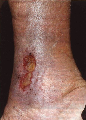 Трофические язвы кожи, образовавшиеся вследствие венозной недостаточности, стоит их отличать от язв посттравмтического происхождения, инфекционных язв (пиогенные, сифилитические, туберкулоды). Такие язвы всегда с явно выраженным воспалением. Дно язвы ровное, слизитая розовая, язва заполнена гнойным отделяемым.