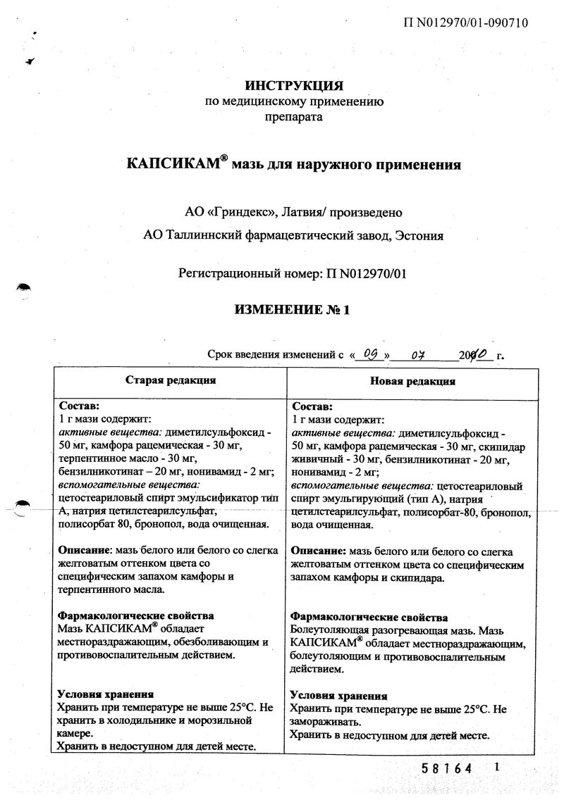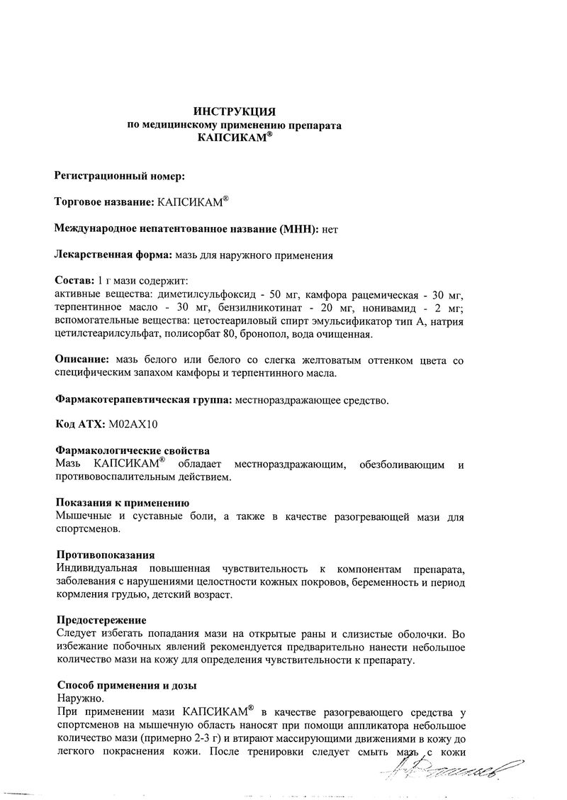 Описание лекарственного средства Капсикам® не предназначено для назначения лечения без участия врача.