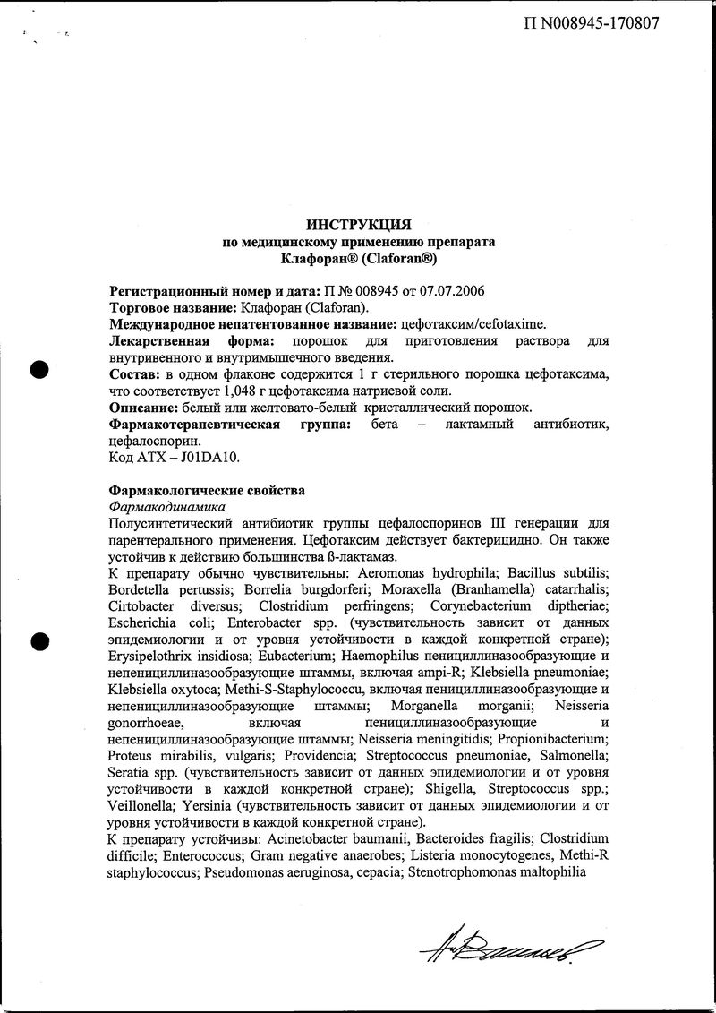 Клафоран® (Claforan®), описание лекарства, фармакологические действия, действующие вещества и формы выпуска