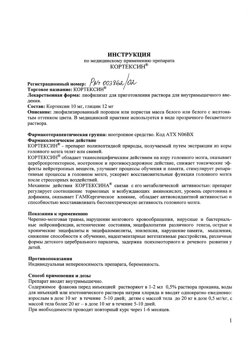 - Действующее вещество: Полипептиды коры головного мозга скота