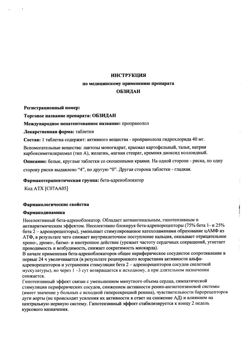 Обзидан® (Obsidan®), описание лекарства, фармакологические действия, действующие вещества и формы выпуска