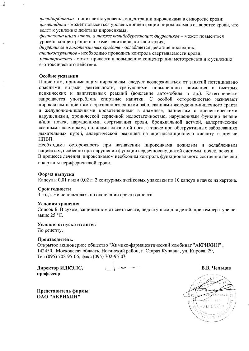Описание лекарственного средства Пироксикам-Акри® не предназначено для назначения лечения без участия врача.