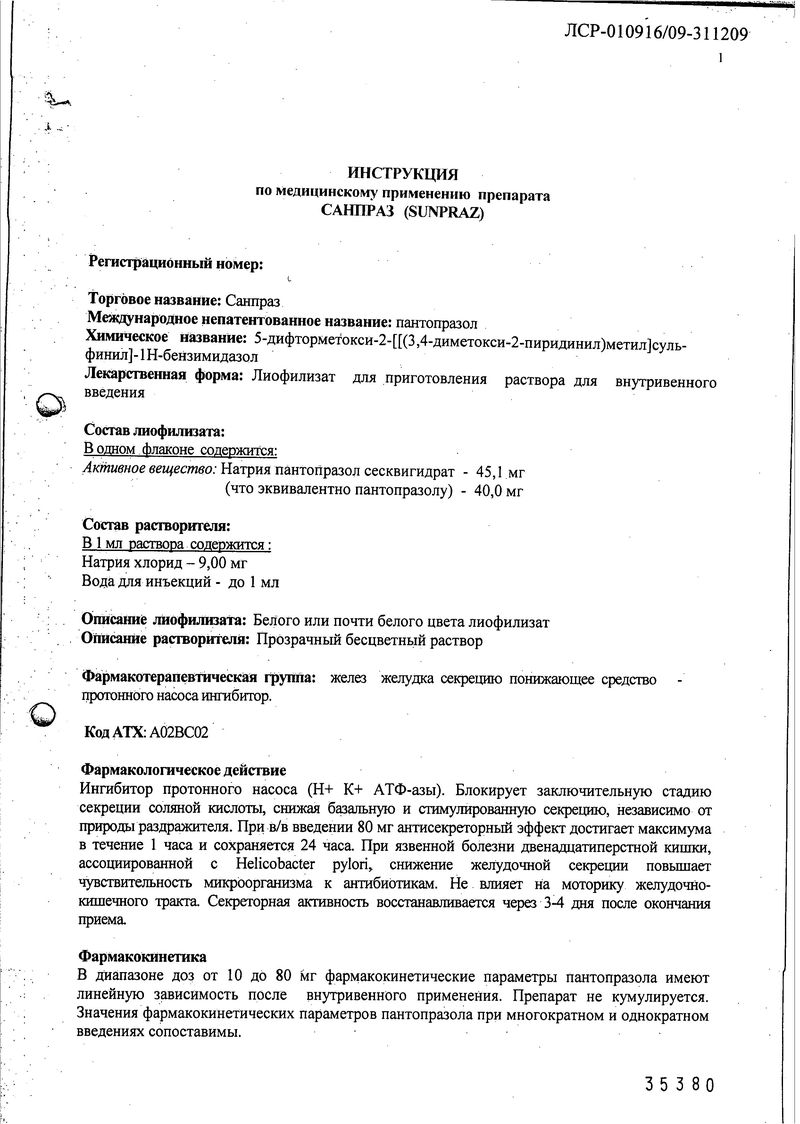Санпраз (Sunpras), описание лекарства, фармакологические действия, действующие вещества и формы выпуска