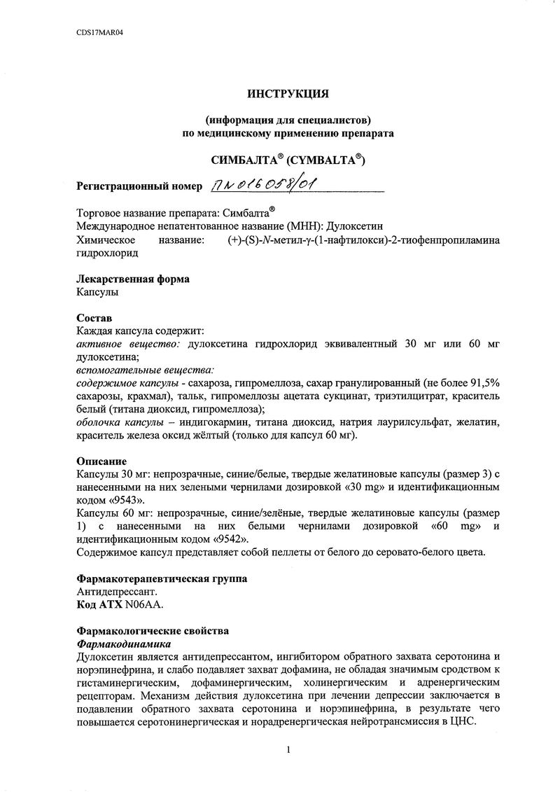 Симбалта (Cymbalta), описание лекарства, фармакологические действия, действующие вещества и формы выпуска