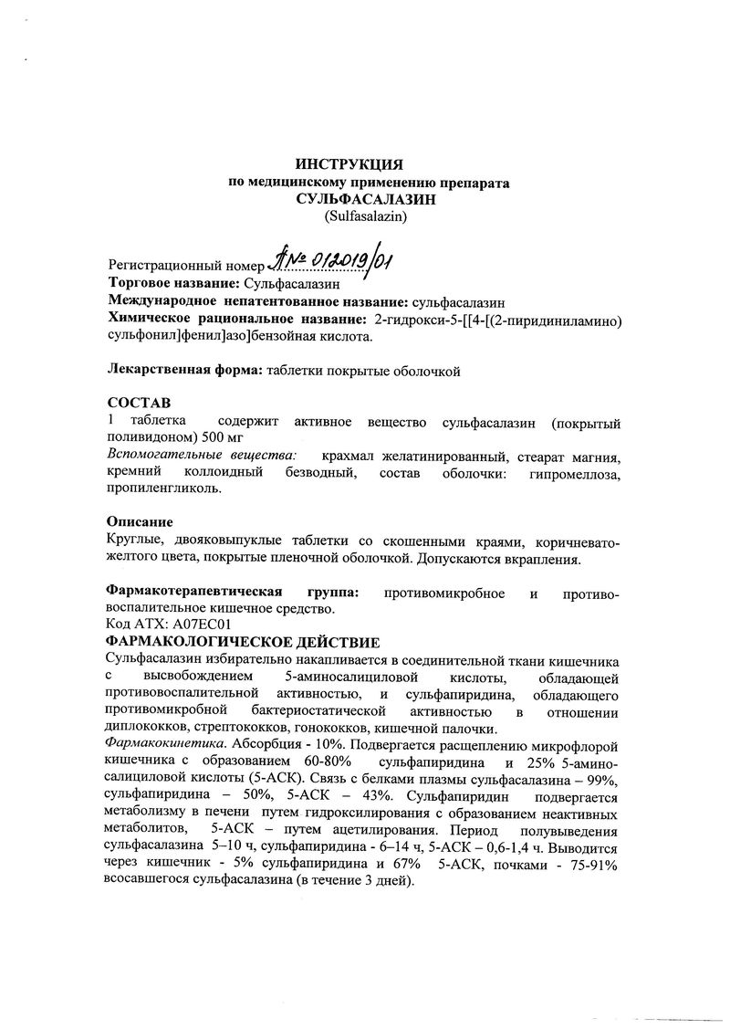 Описание лекарственного средства Сульфасалазин не предназначено для назначения лечения без участия врача.