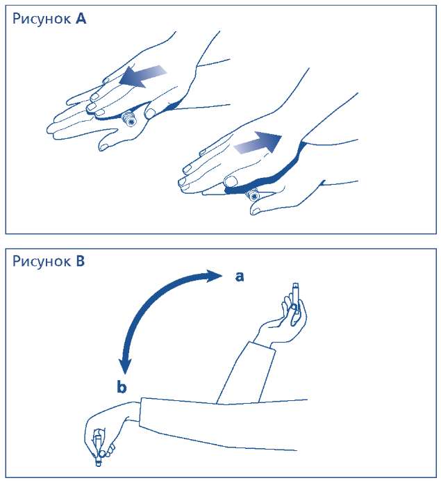 -Перед тем, как устанавливать картридж в систему для введения инсулина первый раз покатайте картридж между ладонями 10 раз -важно, чтобы при этом картридж находился в горизонтальном положении (см. рисунок А). Затем поднимите и опустите картридж вверх-вниз как показано на рисунке В (между положениями а и b), так чтобы стеклянный шарик внутри картриджа перемещался от одного конца к другому. Повторите это не менее 10 раз. Данные манипуляции следует повторять до тех пор, пока жидкость не станет равномерно белой и мутной. Сразу же сделайте инъекцию.