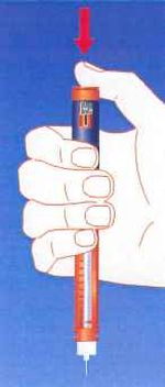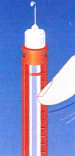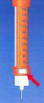 ![]() 14. Нельзя начинать инъекцию инсулиновой суспензии (мутновато-белого инсулина), если через малое смотровое окошко виден резиновый поршень, поскольку для перемешивания инсулина стеклянному шарику необходимо пространство. |