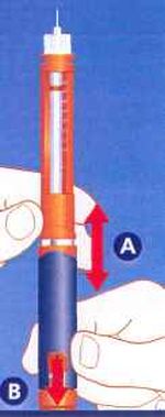Держатель картриджа Пенфилл® снабжен шкалой, отметки которой показывают приблизительное количество единиц препарата, оставшегося в картридже Пенфилл®. Следует обязательно убедиться, что оставшегося количества инсулина достаточно для инъекции. Установите необходимое для инъекции количество единиц. Половины единиц обозначены длинными штрихами между числами. ![]() 10. Если Вы установили дозировку больше требуемой, то следует оттянуть механическую часть и держатель картриджа Пенфилл® друг от друга, как показано на рисунке A. Удерживая их в этом положении, нажмите пусковую кнопку (прижимая ее к какой-либо твердой поверхности), возвратите ее в нулевое положение и ослабьте зажим B. Теперь можно установить нужное количество единиц.