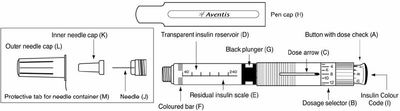 Остаточная инсулиновая шкала (Е) на прозрачном резервуаре (D) показывает оставшееся количество инсулина в шприц-ручке. Данной шкалой нельзя пользоваться для установки дозы вводимого инсулина. Она предназначена только для примерного определения оставшегося объема инсулина в шприц-ручке. В случае, если черный поршень (G) находится близко к отметке «40» в начале цветной полосы (F), то оставшееся количество инсулина в шприц-ручке примерно 40 ME. Конец цветной полосы означает, что оставшееся количество инсулина составляет примерно 20 ME. В случае, если поршень перешел за границу цветной полосы, то оставшееся количество инсулина в шприц-ручке - менее 20 ME (рисунок 6-а). Кнопка (А) позволит также провести последующую проверку: она блокируется на уровне, означающим количество оставшегося инсулина в шпрц-ручке. Например, если стрелка - указатель дозы была установлена на отметке 20 ME, a кнопка (А) была при вытаскивании остановлена на уровне 12 ME, то пациенту могут быть введены только 12 ME (рисунок 6-б). В данном случае либо недостающие 8 ME должны быть введены при помощи новой шприц-ручки ОптиСет, либо все 20 ME должны быть введены при помощи новой шприц-ручки ОптиСет. При разработке дизайна данной ручки был использован международный инсулиновый цветовой код, размещенный на кнопке (I), а также на инсулиновом резервуаре (F). |