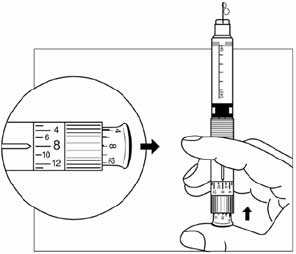 (а) Проверьте, чтобы стрелка указания дозы (С) указывала на цифру 8 (рисунок 2). (б) Вытащите кнопку (А) до конца, снимите внутренний и наружный колпачки иглы (К и L) и держите шприц-ручку ОптиСет иглой вверх.
