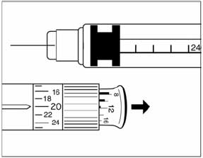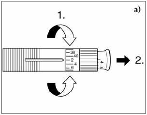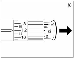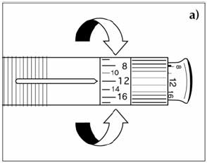 (а) Установите необходимую дозу инсулина путем вращения селектора дозы (В) в любом направлении до необходимой цифры напротив стрелки указания дозы (С) (рисунок 4-а). (Селектор дозы имеет шаг, равный 2 ME). (б) После установки нужной дозы необходимо вытащить кнопку (А) до конца (рисунок 4-6). Кнопка (А) позволяет проверить правильность выбранной дозы. После того, как кнопка вытащена, последняя жирная видимая черта указывает выбранную дозу (например, на рисунке 4-б вытянутая кнопка (А) указывает на дозу, равную 12 ME). (в) Инъекция. Введите иглу в кожу и нажмите кнопку до упора вниз (рисунок 4-в). Оставьте иглу, введенной в течение хотя бы 10 секунд (можно медленно сосчитать до 10). Продолжая нажимать на кнопку (А), извлеките иглу из кожи. Выполняя эти рекомендации последовательно, можно быть уверенным в полном введении выбранной дозы. |
