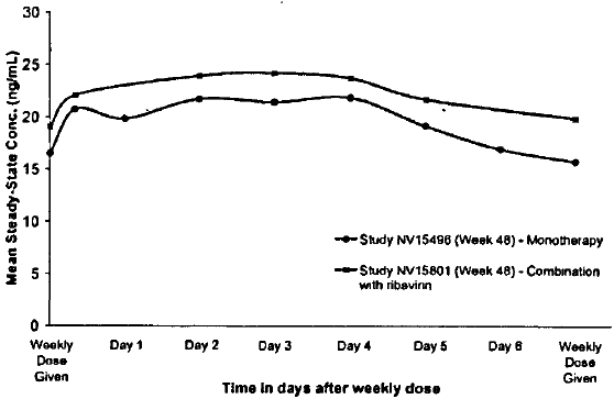 При введении пэгинтерферона альфа-2а 1 раз в неделю наблюдается дозозависимое увеличение системного воздействия у здоровых добровольцев и у пациентов с хроническим гепатитом В или С. У больных хроническим гепатитом В и С через 6-8 недель терапии пэгинтерфероном альфа-2а один раз в неделю достигается равновесная концентрация, которая в 2-3 раза выше, чем после однократного введения. После 8-й недели лечения при введении препарата один раз в неделю дальнейшей кумуляции не происходит. Через 48 недель терапии соотношение максимальной и минимальной концентрации составляет 1.5 - 2.0. Концентрации пэгинтерферона альфа-2а в сыворотке поддерживаются в течение всей недели (168 ч) после введения (рис.1).