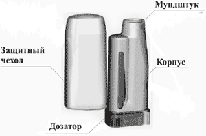 Ингалятор состоит из защитного чехла и корпуса. В верхней части корпуса расположен мундштук, а в нижней - дозатор лекарственного средства. Дозатор представляет собой подвижную пластину с калиброванной лункой, рассчитанной на одну дозу. Ингалятор перезаправке не подлежит.