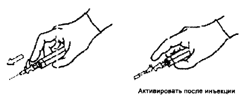После извлечения иглы из ягодичной мышцы незамедлительно активировать защитное устройство иглы, надавливая на рычаг с переводом его в крайнее переднее положение до тех пор, пока кончик иглы не будет полностью закрыт (см. Рисунок 2). Для удобства плоскость «скоса» кончика иглы соответствует расположению рычага на устройстве безопасности, как показано на Рисунке 3. При активации защитного механизма возможны минимальные брызги жидкости, которая может оставаться на игле после инъекции. Визуально убедиться, что рычаг переведен в крайнее положение и кончик иглы полностью закрыт. Если не удается активировать защитное устройство иглы, немедленно поместите иглу в стандартный контейнер для игл.
