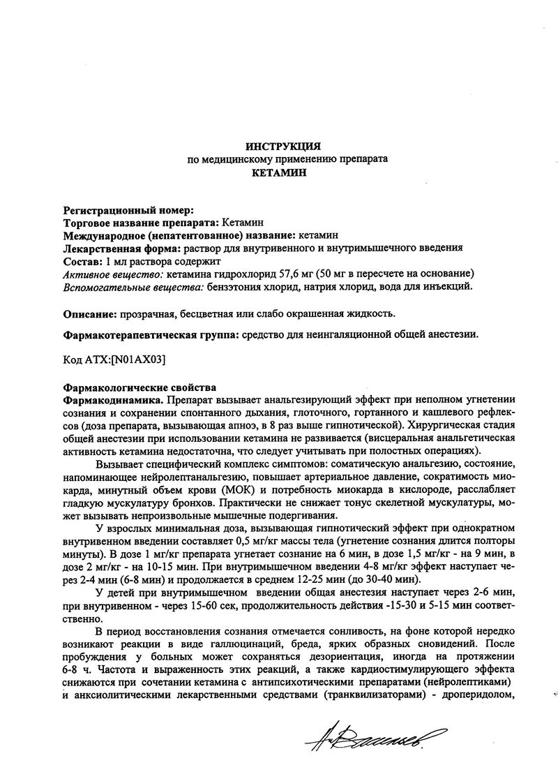 Фармакодинамика. Препарат вызывает анальгезирующий эффект при неполном угнетении сознания и сохранении спонтанного дыхания, глоточного, гортанного и кашлевого рефлексов (доза препарата, вызывающая апноэ, в 8 раз выше гипнотической). Хирургическая стадия общей анестезии при использовании кетамина не развивается (висцеральная анальгетическая активность кетамина недостаточна, что следует учитывать при полостных операциях).