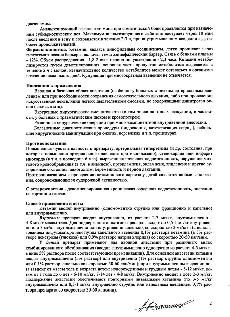 Фармакокинетика. Кетамин, являясь липофильным соединением, легко проникает через гистогематические барьеры, включая гематоэнцефалический барьер. Связь с белками плазмы - 12%. Объем распределения - 1,8-2 л/кг, период полувыведения - 2,3 часа. Кетамин метаболизируется путем деметилирования; основная часть продуктов метаболизма выделяется в течение 2 ч с мочой, незначительное количество метаболитов может оставаться в организме в течение нескольких дней. Кумуляция при многократном введении не отмечается.