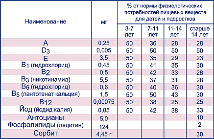 Состав: лецитин, экстракт плодов черники сухой, никотинамид (В3), токоферола ацетат (Е), пантотенат кальция (В5), пиридоксина гидрохлорид (В6), рибофлавин (В2), тиамина гидрохлорид (В1), ретинола пальмитат (А), калия йодат, холекальциферол (D3), цианокобаламин (В12). Вспомогательные вещества: вода, сорбит, акусель (карбоксиметилцеллюлоза), лимонная кислота, гриндстед FF М612 (гуаровая камедь, ксантановая камедь), сорбат калия, ароматизатор идентичный натуральному «Черника», сукралоза.