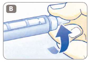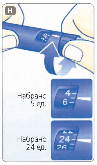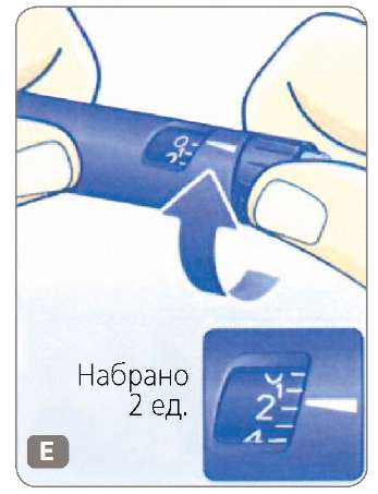Даже при правильном использовании шприц-ручки, перед каждой инъекцией в картридже может скапливаться небольшое количество воздуха. Для предотвращения попадания пузырька воздуха и обеспечения введения правильной дозы препарата: Е Наберите 2 ЕД препарата. |