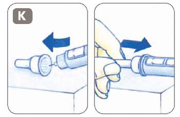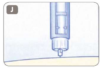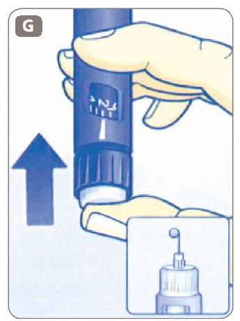 G Удерживая шприц-ручку иглой вверх, нажмите пусковую кнопку до упора. Селектор дозировки возвратится к нулю. На конце иглы должна появиться капля инсулина. Если этого не произошло, замените иглу и повторите процедуру, но не более 6 раз. Если инсулин не поступает из иглы, это указывает на то, что шприц-ручка неисправна и не подлежит дальнейшему использованию. |