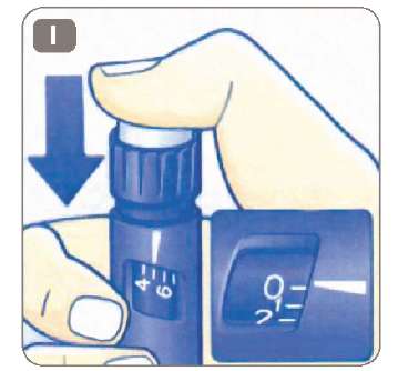 Введение инсулина Введите иглу под кожу. Используйте технику инъекции, рекомендованную Вашим врачом. I Чтобы сделать инъекцию, нажмите пусковую кнопку до упора, пока напротив указателя дозировки не появится «0». Будьте осторожны: при введении препарата следует нажимать только на пусковую кнопку. При повороте селектора дозировки введения дозы не