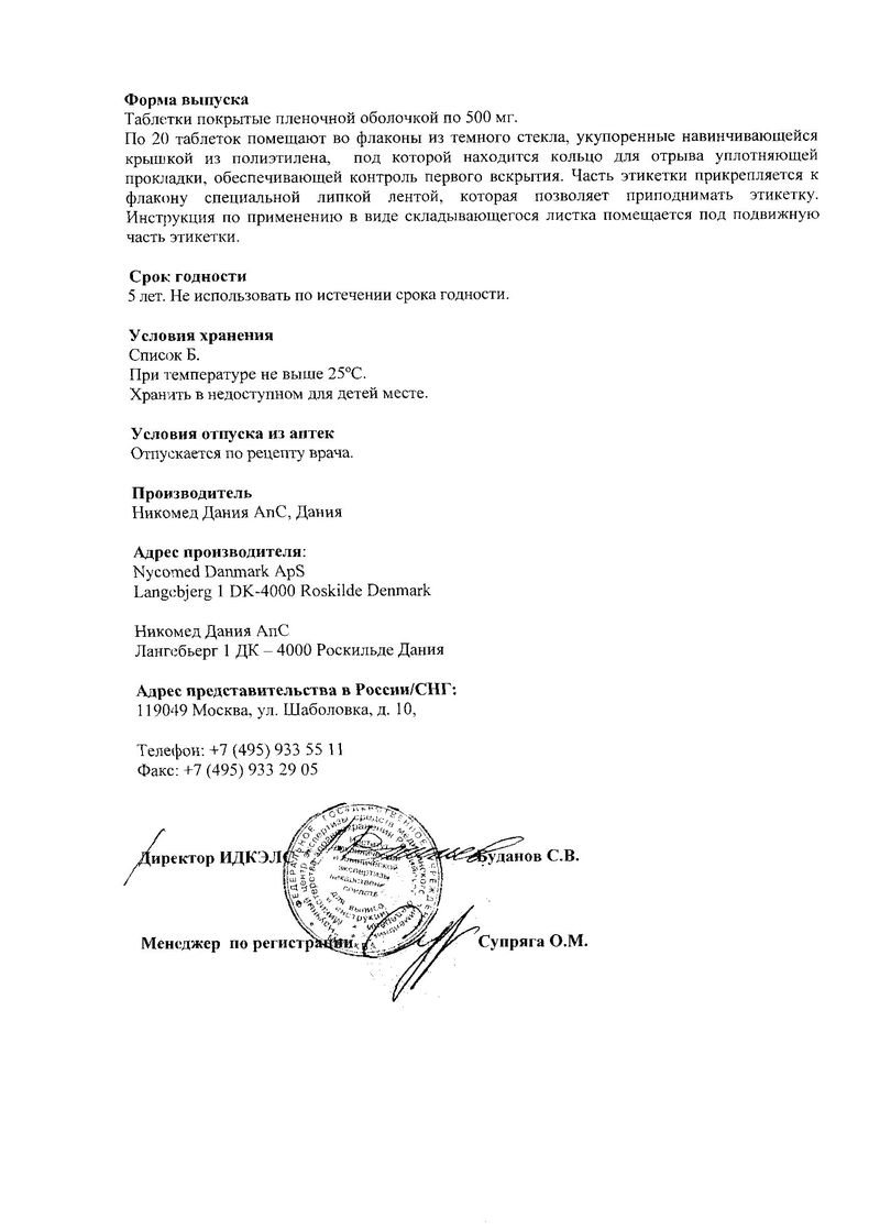 Таблетки покрытые пленочной оболочкой по 500 мг.