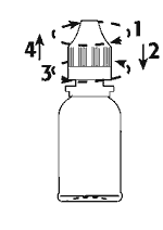 Флакон запечатан. Перед первым употреблением колпачок следует туго закрутить вправо. (1) Игла в колпачке прокалывает отверстие во флаконе. (2) Теперь колпачок можно, как обычно, открутить влево. (3, 4) Оттяните нижнее веко немного вниз. Держите флакон отверстием вниз. Осторожно сжимайте флакон, пока капля не выльется в оттянутое нижнее веко. Закройте глаз на один момент, чтобы капля могла хорошо разойтись. После употребления снова закройте флакон, чтобы предотвратить загрязнение. После вскрытия употреблять флакон не дольше 6 недель. |
